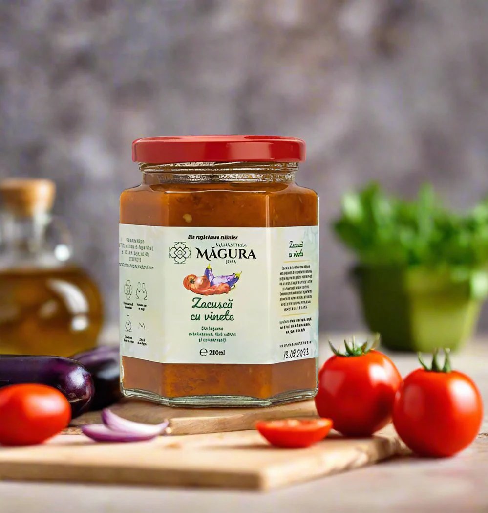 Zacusca de vinete preparată din ingrediente naturale, conține legume din grădini mănăstirești.